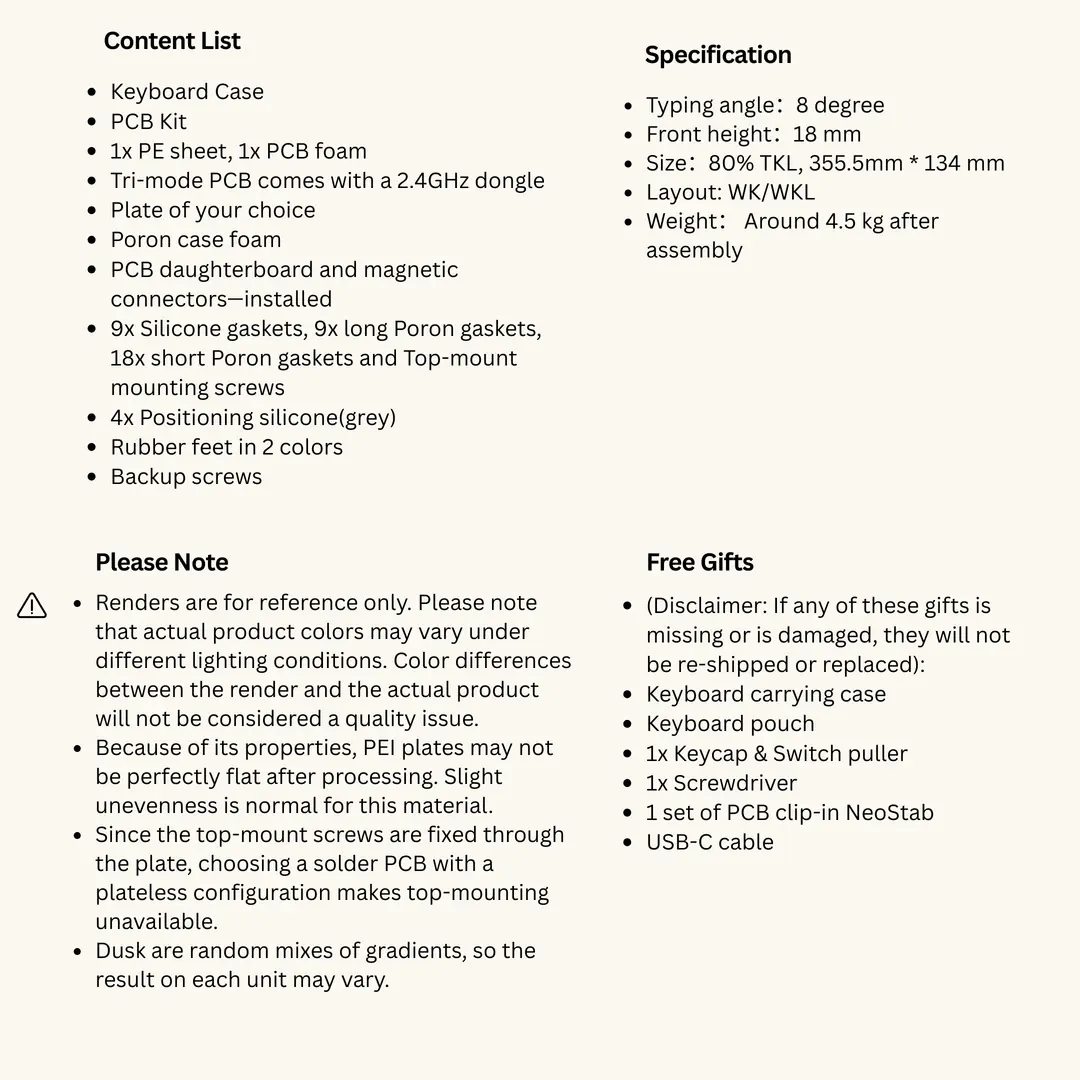The Pre-Order event and product delivery may be postponed, suspended, or subject to changes in case of logistic, technical, administrative permit/approval delays, other processes that may occur at customs and during import (including but not limited to TAREKS inspections) and force majeure situations. Rationalkeys will announce necessary notifications through its website and/or social media accounts.