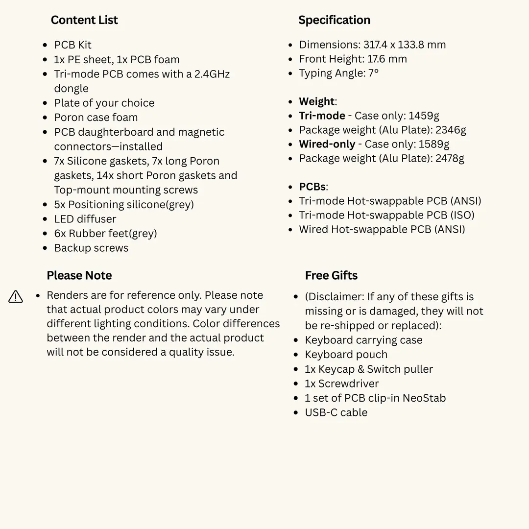 The Pre-Order event and product delivery may be postponed, suspended, or subject to changes in case of logistic, technical, administrative permit/approval delays, other processes that may occur at customs and during import (including but not limited to TAREKS inspections) and force majeure situations. Rationalkeys will announce necessary notifications through its website and/or social media accounts.