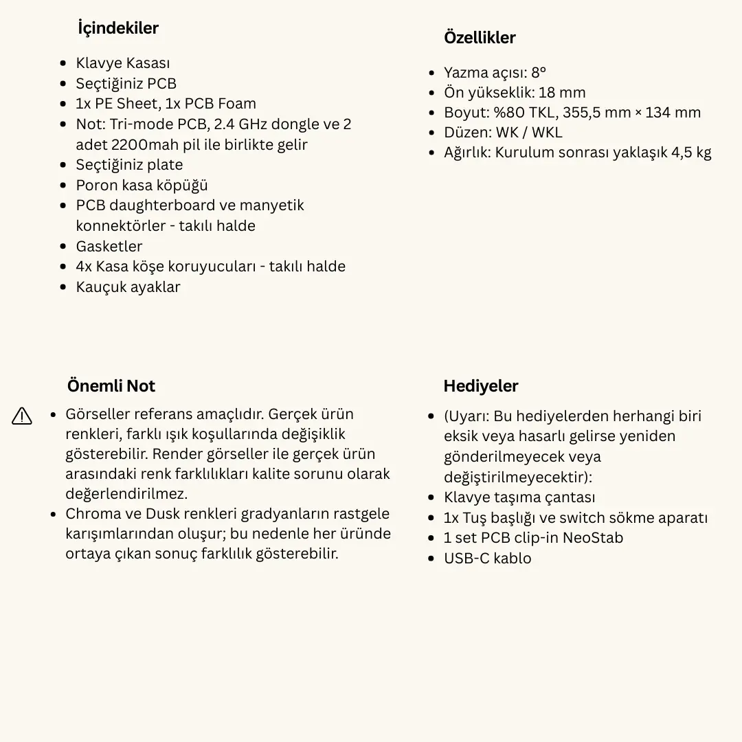 Ön Sipariş etkinliği ve ürünün teslimatı, yaşanabilecek lojistik, teknik, idari izin/onay gecikmeleri, gümrüklerde ve ithalat esnasında yaşanabilecek diğer süreçler (TAREKS incelemeleri dahil fakat bunlarla sınırlı olmamak üzere) ve mücbir sebep hallerinde ertelenebilir, durdurulabilir, değişiklik gösterebilir. Rationalkeys, gerekli bildirimleri web sitesi ve/veya sosyal medya hesapları üzerinden duyuracaktır.