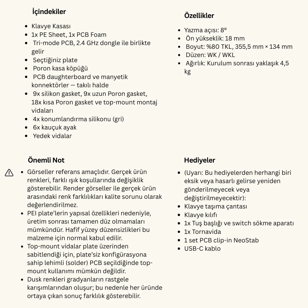 Ön Sipariş etkinliği ve ürünün teslimatı, yaşanabilecek lojistik, teknik, idari izin/onay gecikmeleri, gümrüklerde ve ithalat esnasında yaşanabilecek diğer süreçler (TAREKS incelemeleri dahil fakat bunlarla sınırlı olmamak üzere) ve mücbir sebep hallerinde ertelenebilir, durdurulabilir, değişiklik gösterebilir. Rationalkeys, gerekli bildirimleri web sitesi ve/veya sosyal medya hesapları üzerinden duyuracaktır.